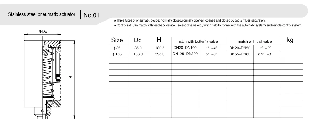 - Double-acting actuator: Driven by dual air sources, providing smooth and stable opening and closing actions, and high durability. Suitable for high-frequency operation scenarios such as continuous production lines.